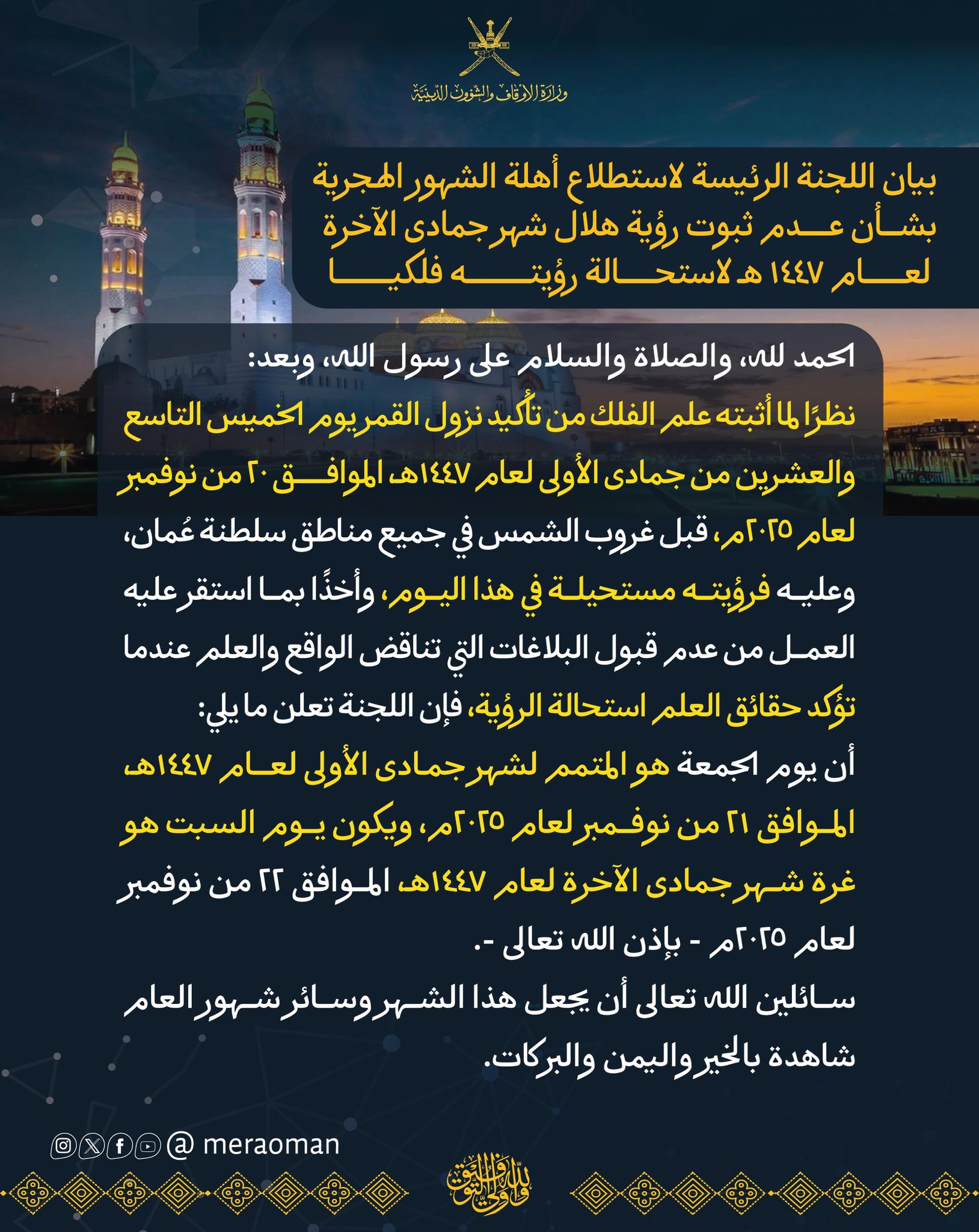 بيان عدم ثبوت رؤية هلال شهر جمادى الآخرة لعام 1447هـ ...