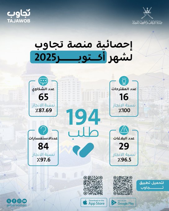 المنصة الوطنية للمقترحات والشكاوى والبلاغات(تجاوب) إحصاءات المنصة الوطنية للمقترحات والشكاوى والبلاغات #تجاوب لوزارة الأوقاف والشؤون ...