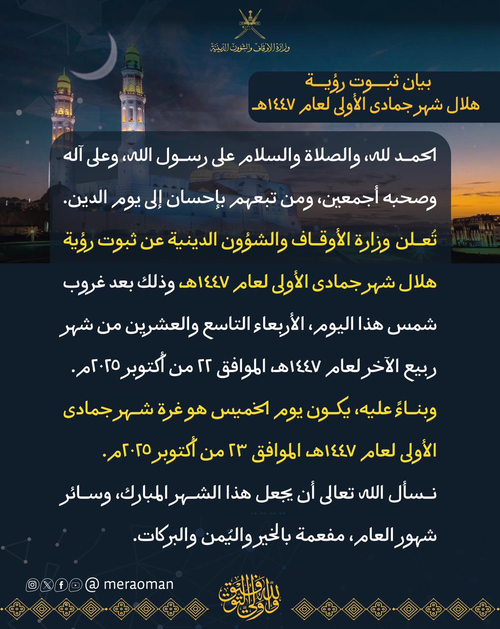 بيان ثبوت رؤية هلال شهر #جمادى_الأولى لعام 1447 هـ ...
